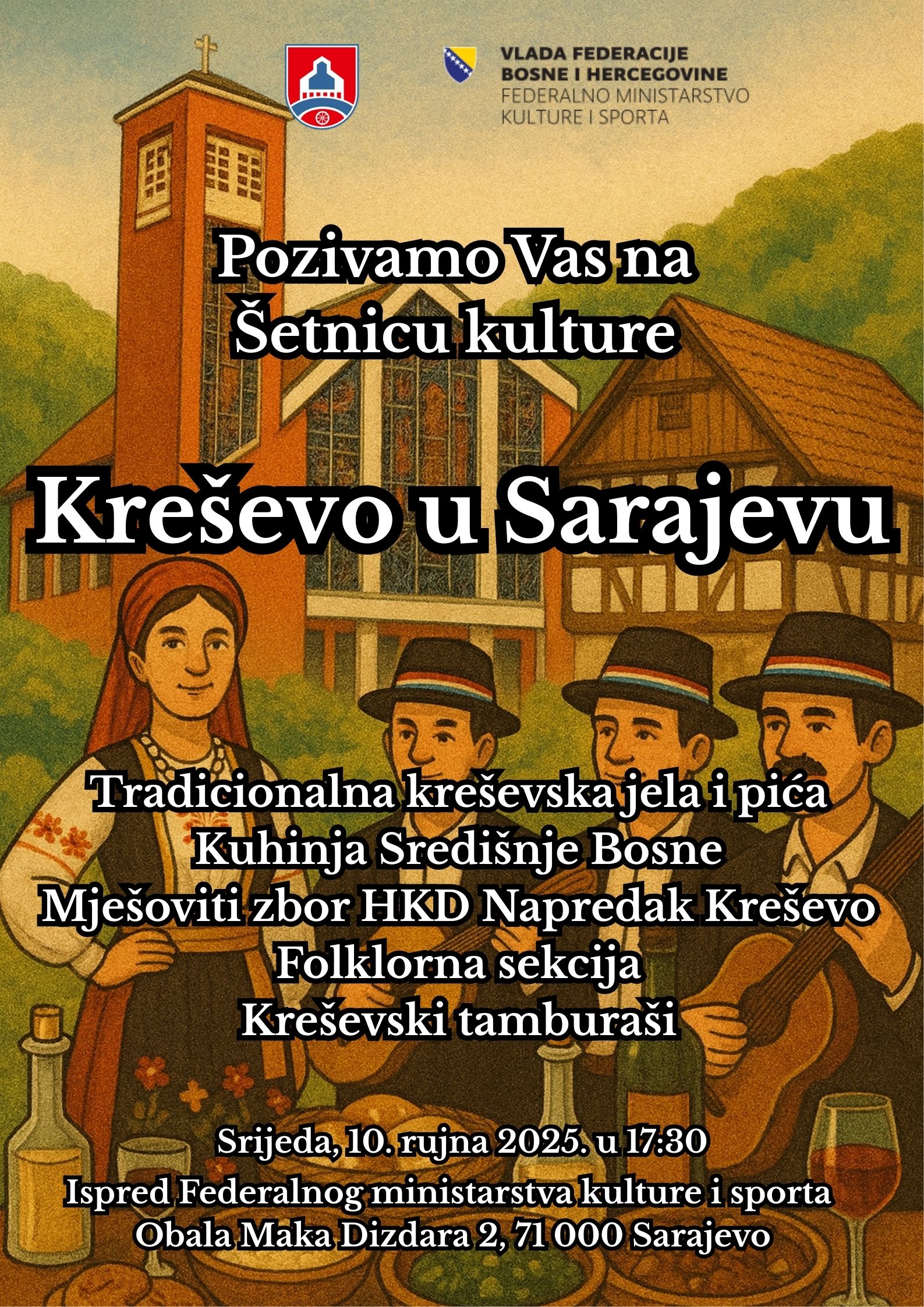 Na poziv Federalnog ministarstva kulture i sporta i ministrice Sanje Vlaisavljević, Kreševo će se u večeras, 10. rujna, predstaviti Sarajlijama i gostima glavnog grada u sklopu manifestacije Šetnica kulture ispred zgrade Ministarstva.