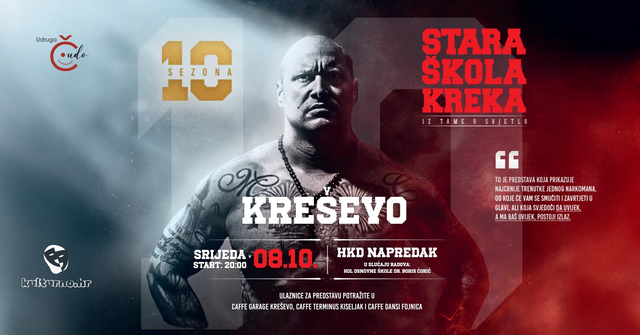 8. listopada u Kreševo stiže Marin Ivanović – Stoka, poznati hrvatski reper, koji će svojom predstavom “Iz tame u svjetlost” govoriti o svom putu kroz ovisnost. Predstava je brutalna, iskrena i autentična!!