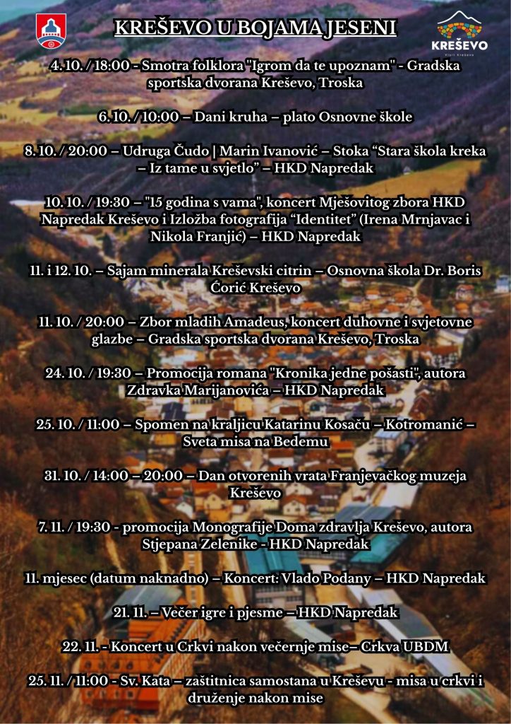 Kreševo će ove jeseni zasjati u bojama tradicije i kulture kroz događaj „Kreševo u bojama jeseni“, koji donosi bogat kulturno – zabavni program. Predstavljamo kulturnu baštinu, umjetničko stvaralaštvo i društveni život Kreševa, te oživljavamo jesen u ”našem malom mistu”.