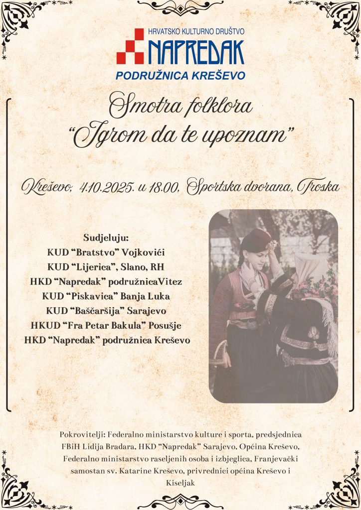 Smotra folklora okupit će brojna kulturno-umjetnička društva iz BiH i regije, a publika će imati priliku uživati u raznolikosti plesova, pjesama, nošnji i običaja. Poseban naglasak bit će na mladim čuvarima tradicije, koji kroz igru, pjesmu i ples čuvaju bogatu narodnu baštinu.